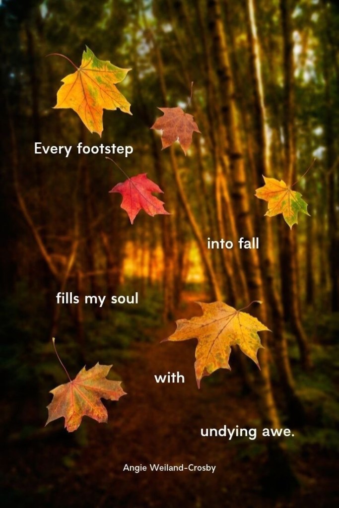 It is crazy how confidence can be shaken by one moment, one comment, one action. We do not realize how our actions, words, feelings effect others even indirectly…how a simple compliment… a single moment can give beauty and release…the colors of the fall do that for me… each leaf a painting etched in my mind..,